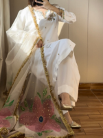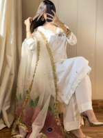 Indulge in the unparalleled luxury of Ivory Canvas. This is Revon Attire’s signature three-piece ensemble. This exquisite Ivory/White creation features a luxurious Tussle Silk shirt. Artisans meticulously hand-embroider it to perfection. The neckline dazzles with Nakshi, Dabka, and pearls. Vibrant two-color Resham work complements these details. Delicate motif and a subtle booti spray adorn the entire shirt. The cuffs also showcase detailed handwork. This adds to its refined charm. Plain matching white trousers offer a refined and elegant complement. The ensemble is completed by a stunning hand-painted dupatta. This unique artistic touch makes it special. The ethereal dupatta is further embellished with Nakshi, sequins, and beads. This creates a harmonious blend of traditional and contemporary artistry. This signature piece is an unparalleled choice for Formal Wear, Festive Wear, and Party Wear. It stands as a distinguished Embroidered Silk Suit. It promises to make every moment unforgettable.
