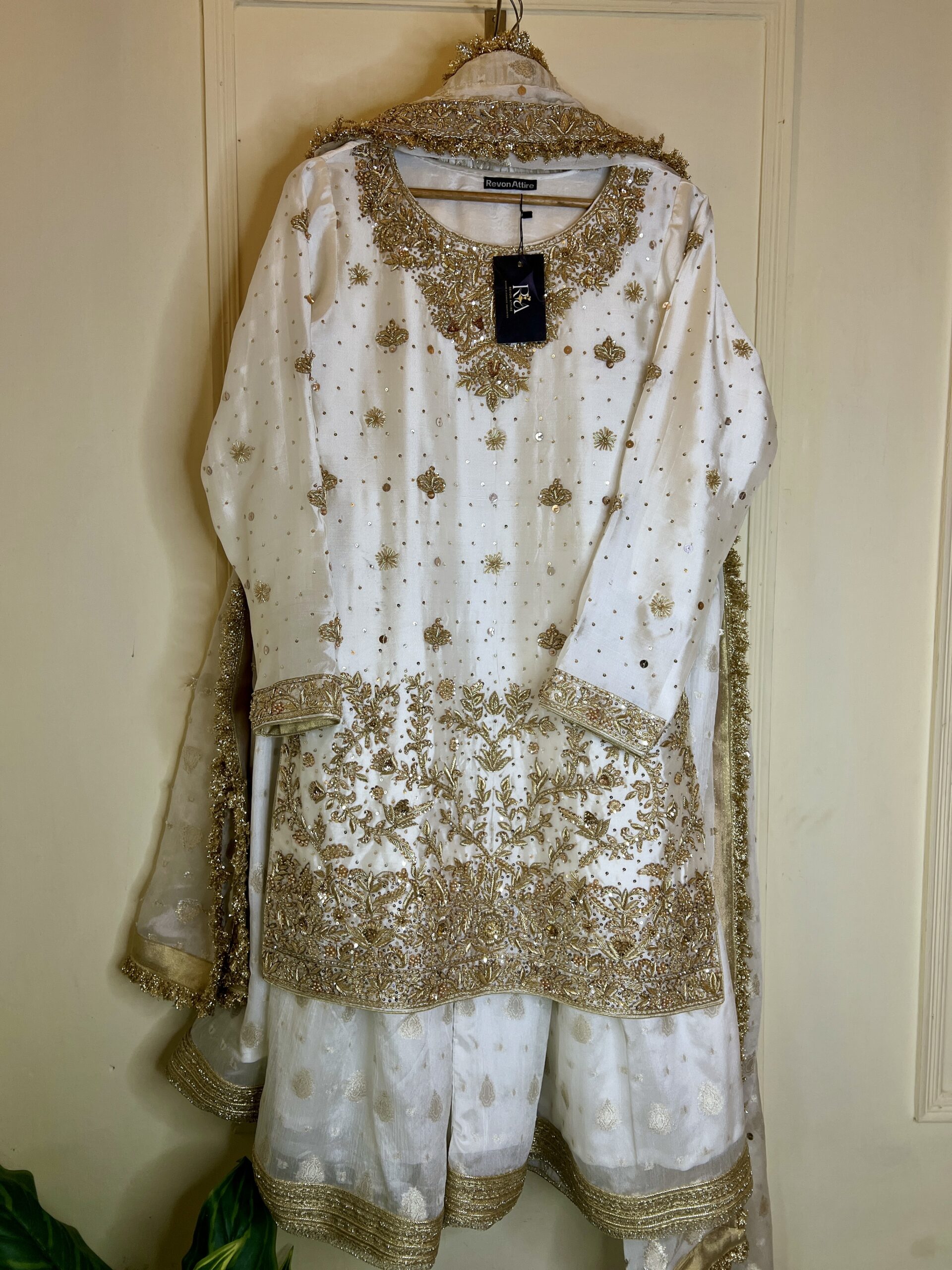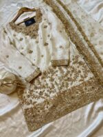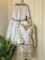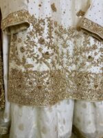 Step into timeless elegance with Noor Celestia, a breathtaking Ivory White Gharara ensemble from Revon Attire, meticulously crafted for your most cherished celebrations. The luxurious Sheesha Silk shirt is a masterpiece of intricate handwork, adorned with Nakshi, Dabka, pearls, and sequins. The embellishments feature a captivating floral and foliate pattern that gracefully covers the neckline, extends down the shirt, and forms a rich border, creating a truly regal aesthetic. Complementing this is a flowing Pure Jamawar Gharara, beautifully detailed with delicate lace on its flare and knee, adding graceful movement. The ensemble is completed with an ethereal Organza dupatta, featuring exquisite handwork on one side that perfectly frames the face. A matching handwork potli accompanies this stunning outfit, making it ideal for bridal events, festive occasions, and grand celebrations where sophistication and tradition meet.