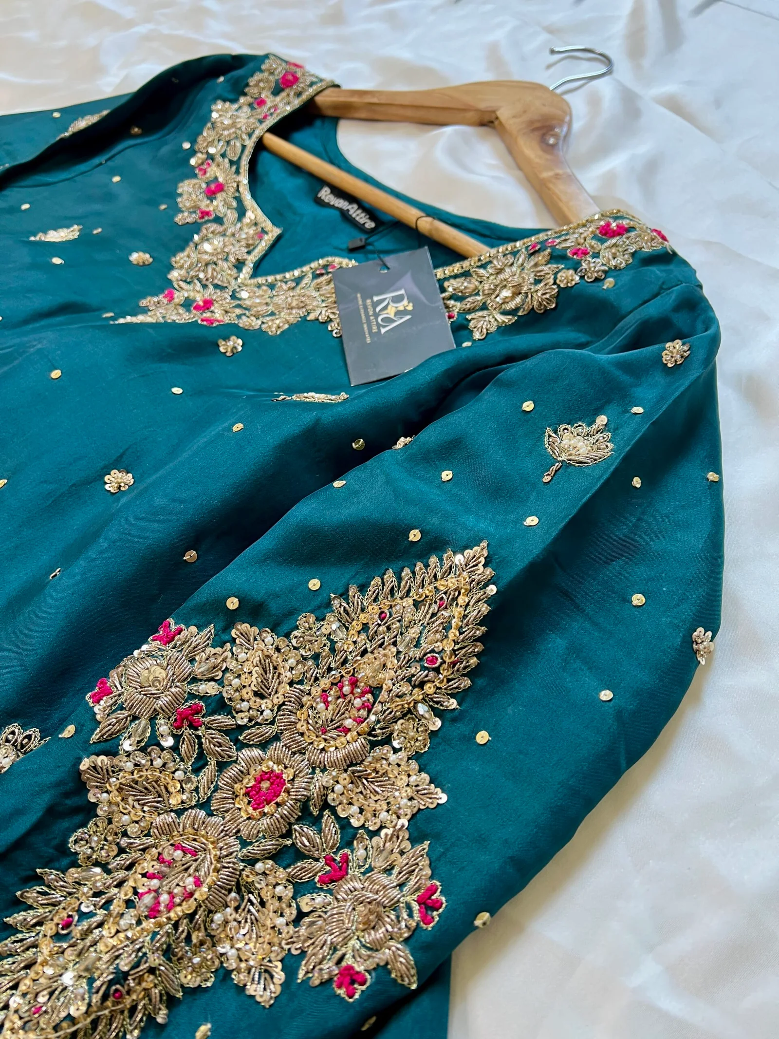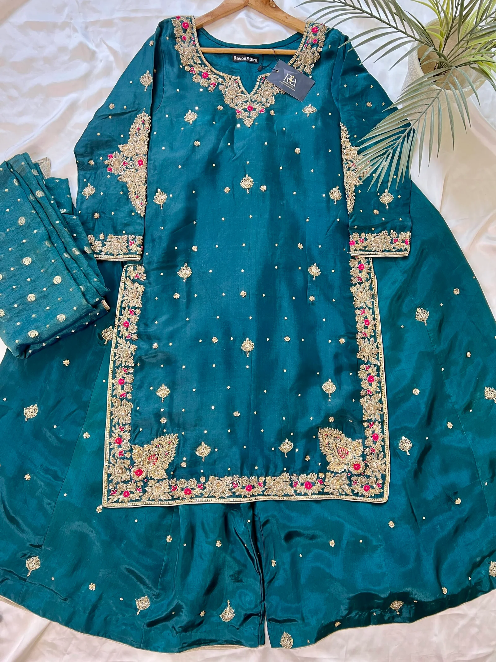 Teal Radiance — a timeless three piece sharara set crafted from pure tussle silk, radiating elegance in every detail.