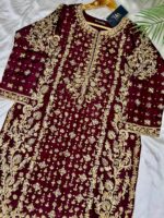 The Farshi Lehnga, made from rich Jamawar fabric, is a vision of opulence. It boasts extensive handwork, including delicate booti and pearl work across its entire expanse and borders, adorning all sides of its grand flare, ensuring a majestic presence with every step. Completing this bridal masterpiece is an elegant net dupatta, gracefully finished with a heavy border on one side and a lighter border on the other, perfectly complementing the ensemble’s rich detailing. Designed for the bride who desires a truly unforgettable and royal look, this ensemble is a testament to timeless beauty and meticulous craftsmanship.