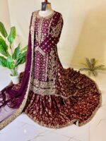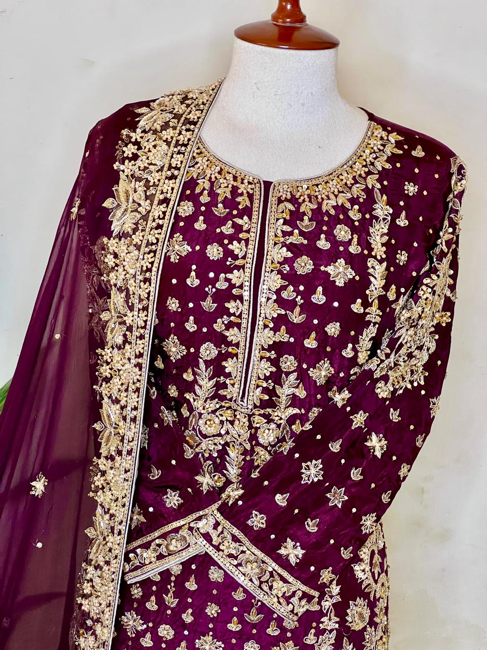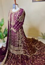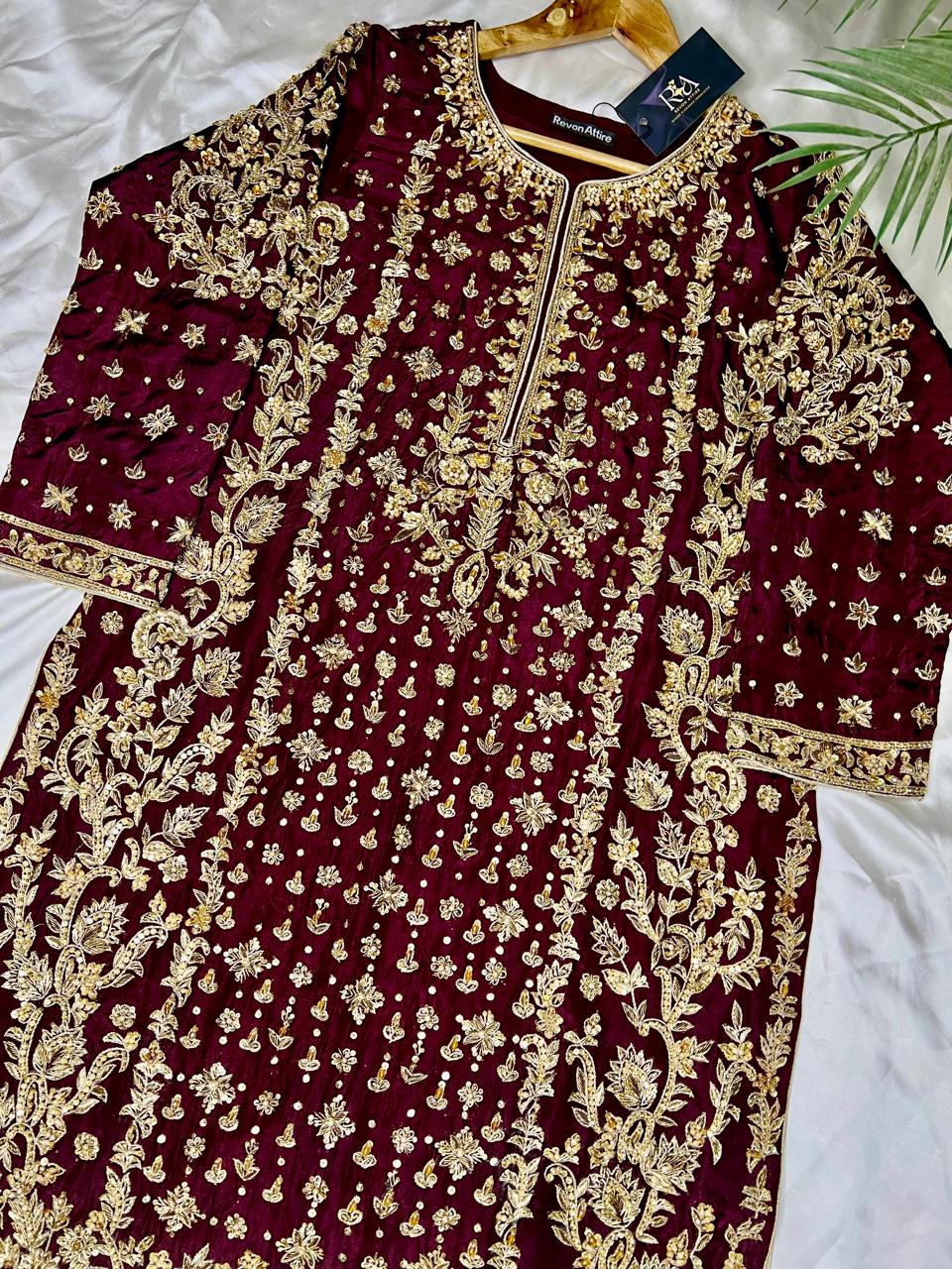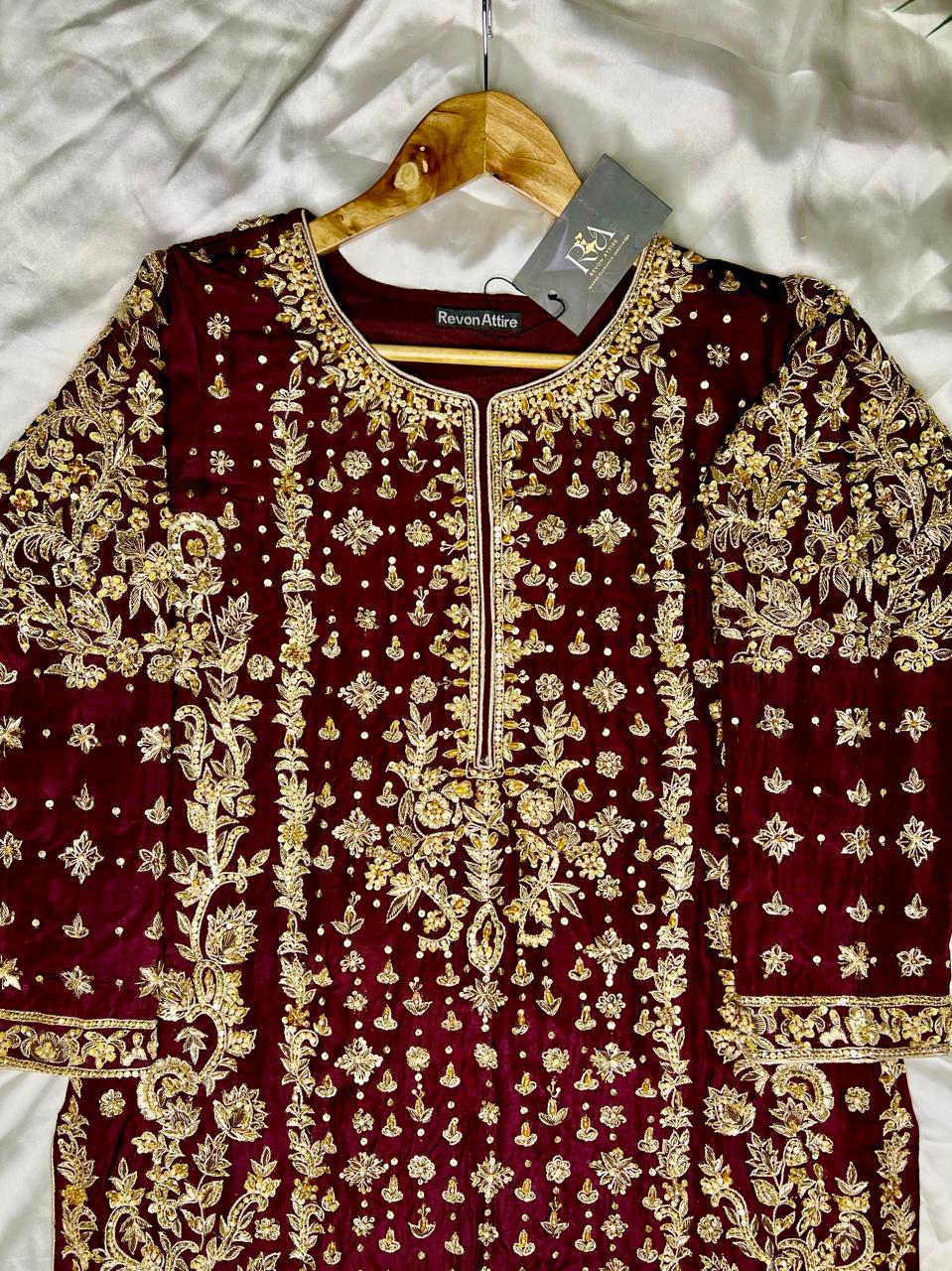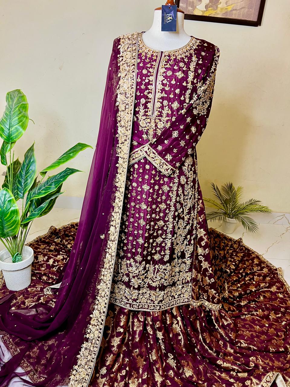 Embrace unparalleled grandeur with this exquisite Plum/Deep Maroon Farshi Lehnga ensemble from Revon Attire, a true celebration of traditional artistry and luxurious design. The heavily embellished shirt, crafted from luxurious Tussle Silk, is a dazzling display of intricate handwork, featuring shimmering Nakshi, classic Dabka, sparkling crystals, and radiant stones, creating a mesmerizing tapestry of detail.